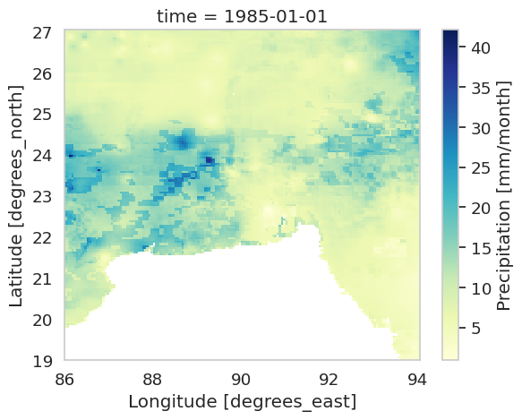 bd_rainfall.sel(time=rainfall['time'].dt.year == 2000)['precip'].isel(time=2).plot(cmap='YlGnBu')