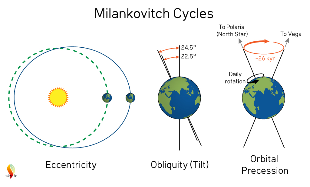 Sedimentary core studies establish that the world has experienced recurring episodes of ice ages and interglacial warm periods. Behind the changes lies the Milankovitch Cycle, minute alterations in the world’s orbit, axis tilt, and rotation about its axis. These affect the quantity of solar radiation that reaches the planet, which in turn, controls planetary climatic patterns.